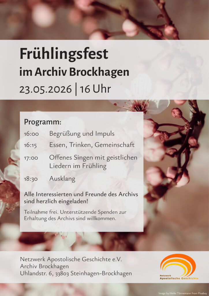 Wir veranstalten am 23. Mai 2026 ein Frühlingsfest im und am Archivgebäude in Brockhagen, Uhlandstraße 6, 33803 Steinhagen. Das Fest richtet sich an Freunde und Nachbarn des Archivs und alle, die daran teilnehmen wollen. Es wird ehrenamtlich gestaltet und ist selbstverständlich für die Teilnehmenden kostenlos. Spenden für den Erhalt des Archivs sind willkommen!